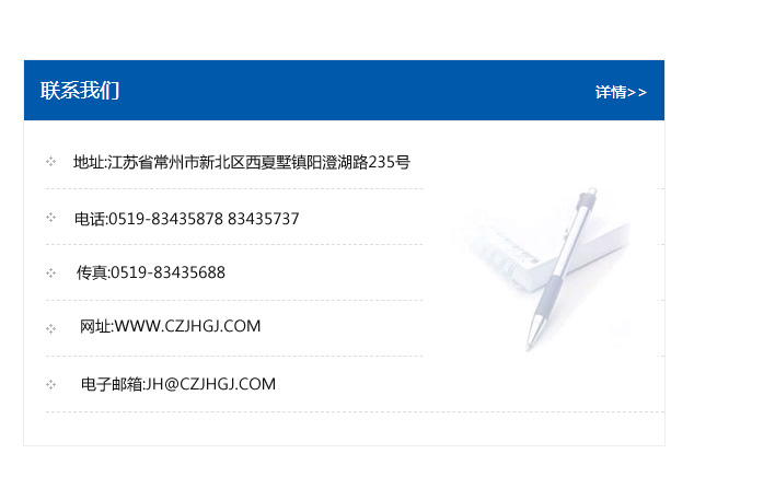 地址:常州市新北區友邦商務大廈1幢16、17層  電話:0519-85101652  傳真:0519-85112595  郵編:213022  網址:www.cz-jiayue_cn.zzydw.com  郵箱:xiajifengaa@163.com
